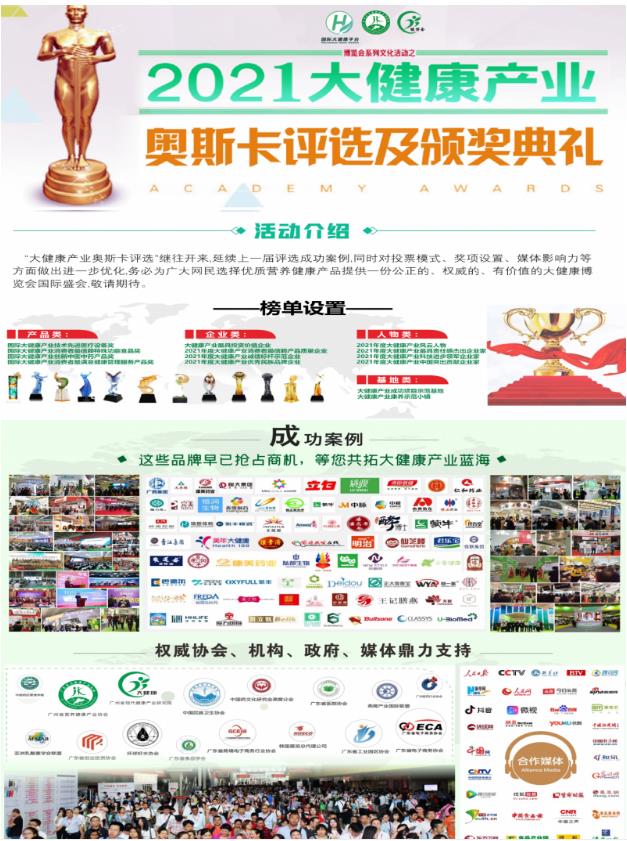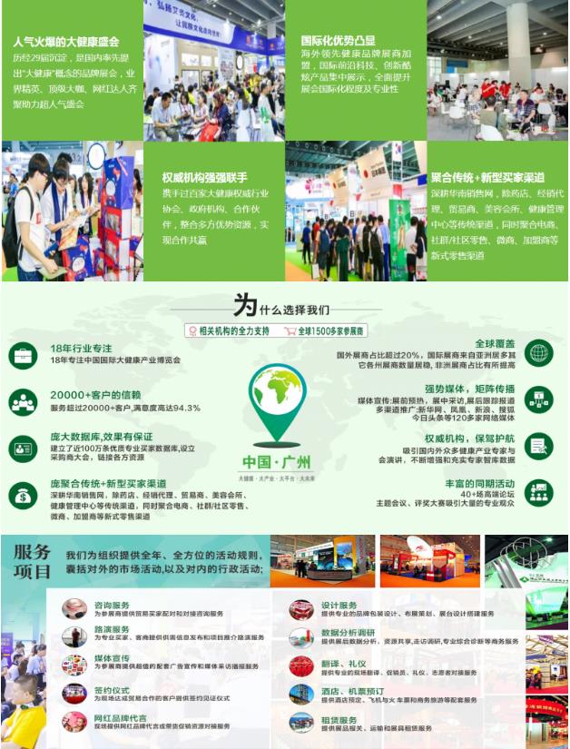 廣東省營養健康產業協會和廣東省現代健康產業研究院聯合多家權威機構組織舉辦的中國(廣州)國際大健康產業博覽會(簡稱:健博會)于2002年經中華人民共和國衛生部(現衛健委)中華人民共和國商務部批準的中國首個“展覽展示、合作交流、凝智聚誠、交易共贏”的平臺,現已成功舉辦29屆,展覽面積突破160萬平方米,參展企業突破4萬家,入場專業觀眾買家超過300萬人次。深度融合大健康上下游產業,充分展示國內外優秀企業新產品、新技術、新趨勢,為政、產、學、研、用各方搭建一個全產業鏈協同發展的廣闊平臺。