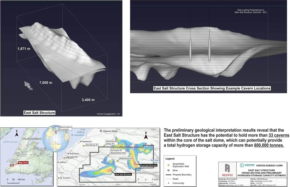 氫啟未來網(wǎng)獲悉,總部位于加拿大的Vortex Energy最近宣布,在加拿大紐芬蘭的60多個鹽穴中,估計可以儲存多達(dá)80萬噸的氫氣。