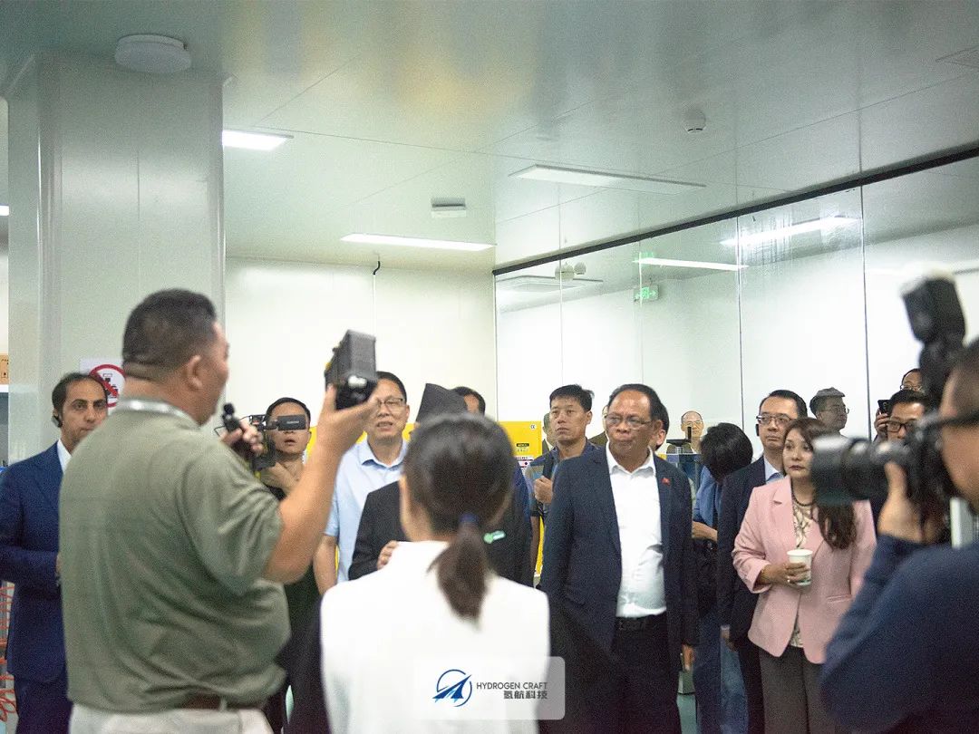 作為國內具有成熟的開發風冷氫燃料電池電堆及其輕量化應用技術及產品的高新技術企業,氫航科技在湖州研發測試中心,為到訪外賓及領導呈現了一場能夠領略前端科技與典范實踐的氫動力之旅。