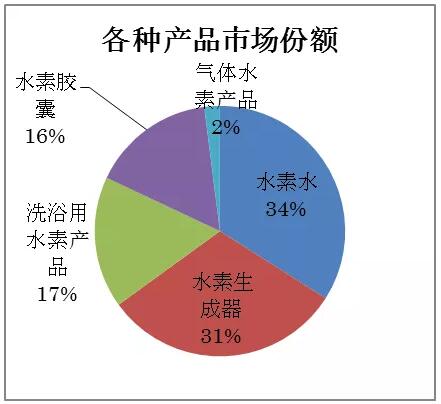 水素水(罐裝,袋裝)在銷售總額中占最大份額(34%),其次是水素生成器(31%),近年洗浴用水素產品出現很多,占17%,再有就是水素膠囊,近兩年急速發展,已達到16%。氣體水素產品在2016年占的份額不多,只有約2%。
