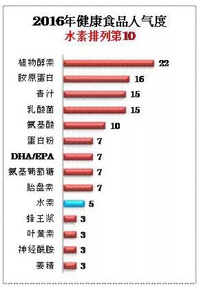 固體水素在2016年的健康食品和化妝品中的人氣度,都進入了前10名,水素搶占健康食品第10位,在化妝品中水素已經占據了第4位。