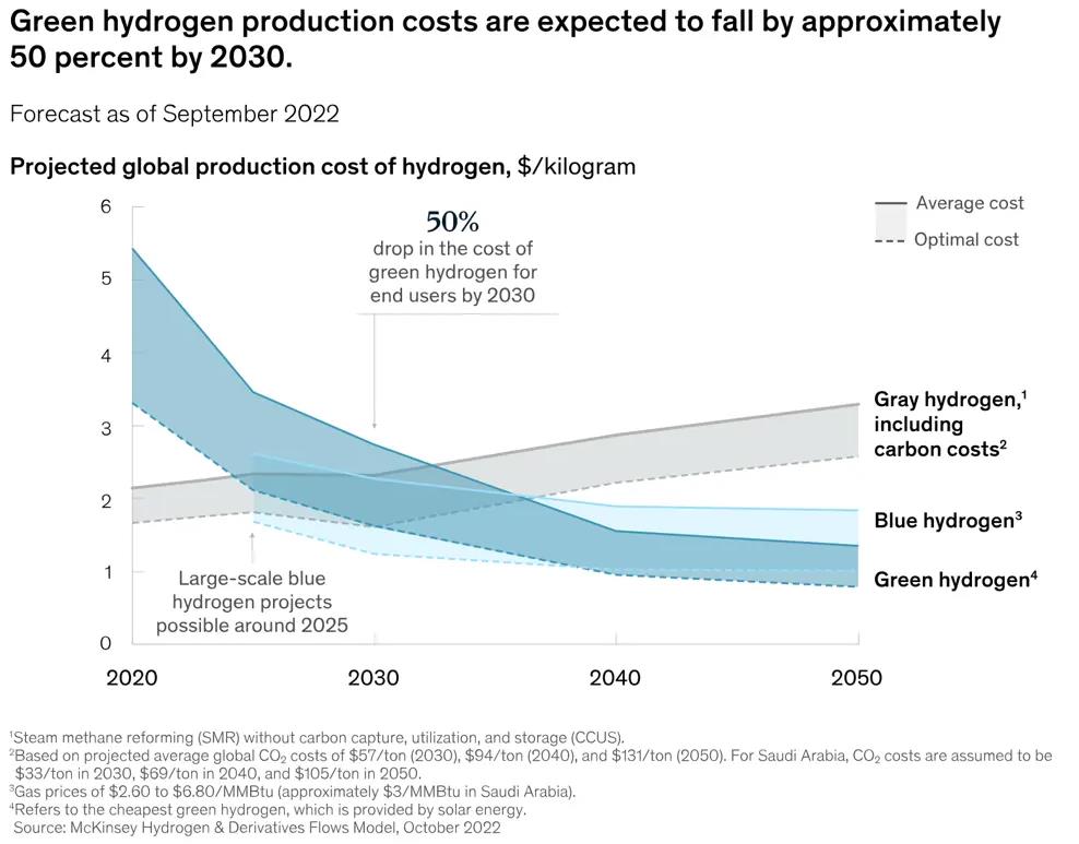 為了實現HRC的氫氣承諾,將需要擴大藍氫和綠氫的競爭供應。隨著電解槽成本的下降,預計到2030年,綠氫成本將下降約50%。