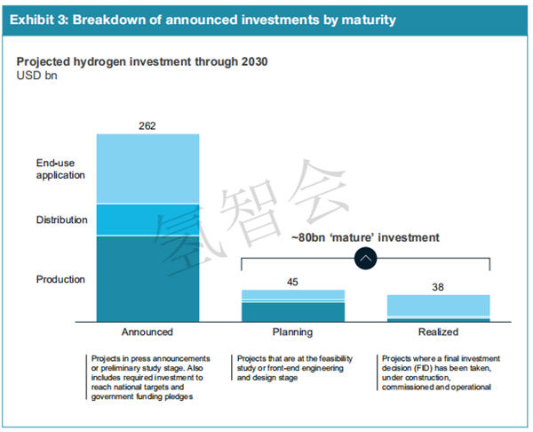 如果所有項目都取得成果,到2030年,總投資將超過3000億美元的氫能支出 — 相當(dāng)于全球能源資金的1.4%。 然而,目前這項投資中只有800億美元可以認為是"成熟"的,這意味著投資要么處于規(guī)劃階段,要么已通過最終投資決定(FID),要么與正在建設(shè)、已經(jīng)委托或運營的項目有關(guān)。