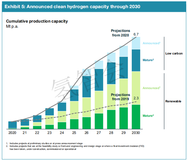 由于對氫的關(guān)注日益增加,加上政府的支持不斷增加,宣布的2030年清潔氫的產(chǎn)能由先前的230萬噸增至每年670萬噸。 換句話說,過去一年,玩家已經(jīng)宣布了三分之二的清潔氫氣產(chǎn)能。