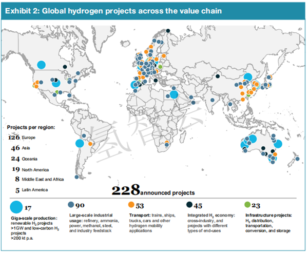 目前,整個價值鏈上有200多個氫氣項目,85%的全球項目來自歐洲、亞洲和澳大利亞,美洲、中東和北非的活動也在加速。
