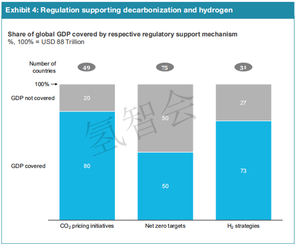 各國政府計劃支持向氫能轉(zhuǎn)型的戰(zhàn)略,將投入700億美元。 政府支持的增加源于全球轉(zhuǎn)向去碳化:75個國家占世界GDP的一半,凈零野心,80%的全球GDP由某種水平的二氧化碳定價機制覆蓋。