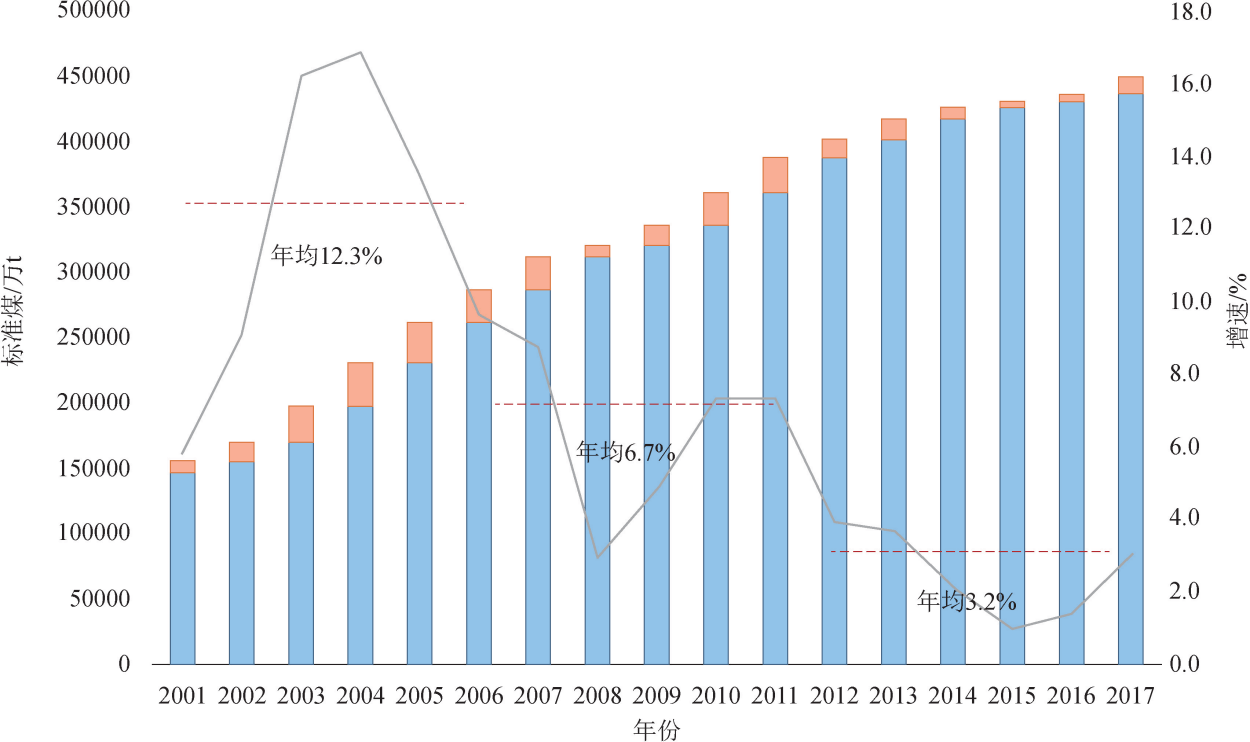 由圖1 可以看出,2001-2007年能源消費總量增速呈臺階式下降,2001-2005年的年均增速為12.3%,2006-2010年的年均增速為7%,2011-2017年的年均增速為3.2%。能源消費增速和增量的 “雙回落” 也使得國內煤炭、煤電、煉油生產能力出現較為嚴重的過剩,產能利用率已跌落至70%甚至更低.
