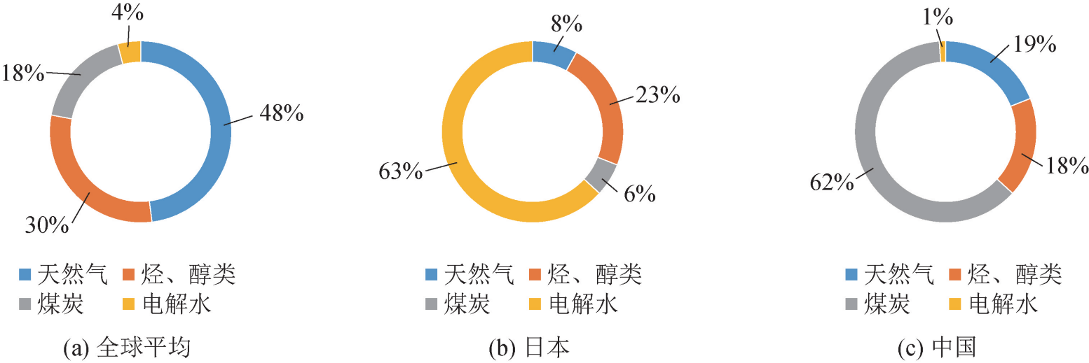 圖5 全球、日本和中國氫源結構對比