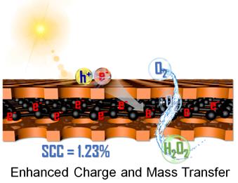 本工作中,合作團隊通過膠束介導界面自組裝策略,在還原氧化石墨烯(rGO)表面生長二維的介孔間苯二酚-甲醛(RF)樹脂,形成RF樹脂-rGO-RF樹脂的三明治結構。材料中的介孔通道猶如植物葉片的氣孔,可以有效的提升材料的傳質能力。合作團隊通過增強材料的電子傳遞和傳質能力,促進了光催化劑的光催化能力;在模擬太陽光下,可實現1.23%的太陽能到化學能的轉化,這是目前文獻報道的粉末催化劑光催化H2O2生產領域的最高效率值。