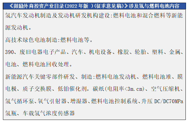 2022年,國家發(fā)展改革委、商務(wù)部就《鼓勵外商投資產(chǎn)業(yè)目錄(2022年版)(征求意見)》公開征求意見。其中多項(xiàng)涉及燃料電池電堆方面。