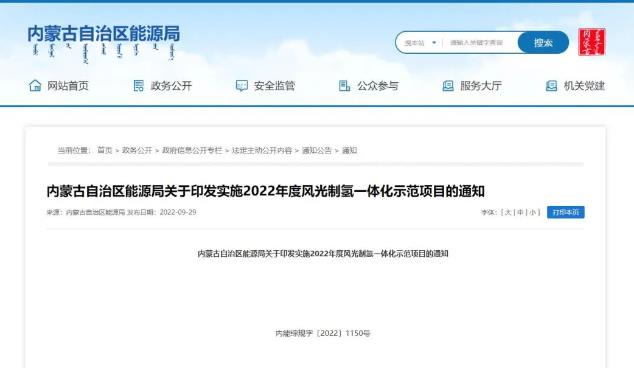 內蒙古自治區能源局關于印發實施2022年度風光制氫一體化示范項目的通知