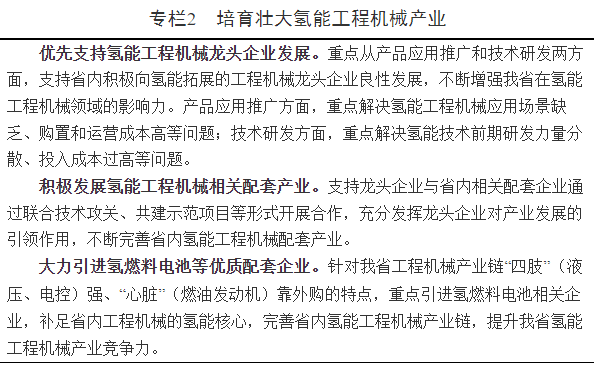省內(nèi)工程機械行業(yè)氫動力化有望形成新增長點。雙碳背景下,工程機械行業(yè)動力電氣化、氫能化轉型勢在必行。隨著省內(nèi)龍頭企業(yè)加大氫動力工程機械尤其是氫燃料電池發(fā)動機研發(fā)力度,憑借我省世界級工程機械產(chǎn)業(yè)集群優(yōu)勢,將有可能形成新的經(jīng)濟增長點,帶動產(chǎn)業(yè)實現(xiàn)二次騰飛。