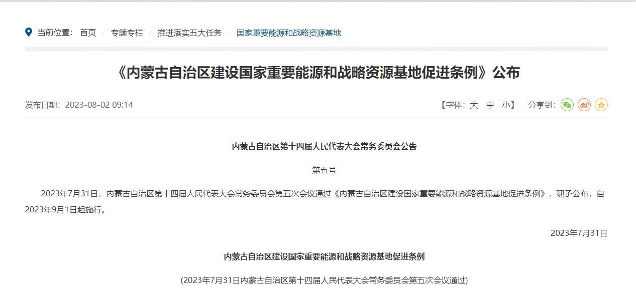 [ 導(dǎo)讀 ]《內(nèi)蒙古自治區(qū)建設(shè)國家重要能源和戰(zhàn)略資源基地促進(jìn)條例》