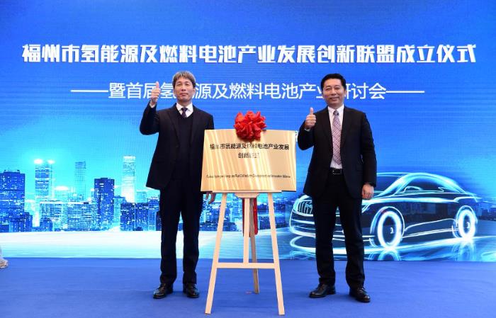 在成立大會上,由福州市人大常委會副主任游通鈴與氫能聯(lián)盟理事長單位福建雪人股份有限公司代表林汝捷共同為“福州市氫能源及燃料電池產業(yè)發(fā)展創(chuàng)新聯(lián)盟”揭牌。
