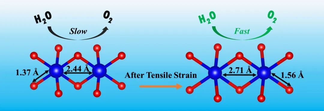 團(tuán)隊(duì)采用金屬錳替代磷酸鈷中部分鈷,顯著增強(qiáng)了磷酸鈷的電催化OER性能。擴(kuò)展邊X射線精細(xì)結(jié)構(gòu)(EXAFS)和原位Raman實(shí)驗(yàn)表征發(fā)現(xiàn),錳元素的引入可使得磷酸鈷晶格發(fā)生拉伸應(yīng)變,有利于*OH的吸附以及催化劑表面快速重構(gòu)為高催化活性的羥基氧化鈷,從而提升了電催化OER性能。相關(guān)工作發(fā)表在《Journal of Colloid and Interface Science》,2021級(jí)碩士生徐欣玥為論文第一作者,陳翔博士、柳東明教授和南京郵電大學(xué)朱先軍副教授為論文共同通訊作者。