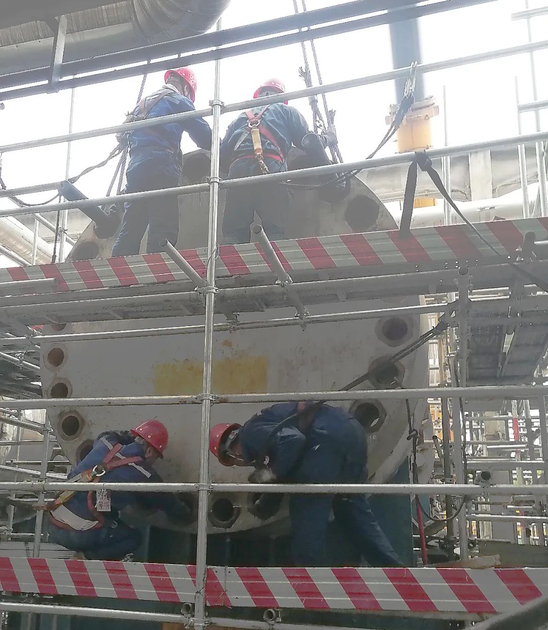 期間,檢維修事業(yè)部以學(xué)習(xí)貫徹習(xí)近平新時(shí)代中國(guó)特色社會(huì)主義思想主題教育和“三抓三促”行動(dòng)為契機(jī),成立黨員突擊隊(duì)、青年先鋒隊(duì),黨員突擊隊(duì)帶領(lǐng)青年先鋒隊(duì)分組作業(yè),每組設(shè)立安全監(jiān)護(hù)人員,落實(shí)“專(zhuān)人專(zhuān)項(xiàng)監(jiān)管”責(zé)任,對(duì)關(guān)鍵施工工序、關(guān)鍵設(shè)備進(jìn)行重點(diǎn)管控,確保施工質(zhì)量和節(jié)點(diǎn)進(jìn)度。經(jīng)過(guò)1個(gè)月緊張施工,圓滿完成4臺(tái)換熱器所有殼程管程螺栓拆除、Ω環(huán)和密封盤(pán)更換焊接及無(wú)損檢測(cè)、管束抽出回裝、殼程管程壓力試驗(yàn)等工序,并順利通過(guò)驗(yàn)收,得到了客戶的高度認(rèn)可與好評(píng)。