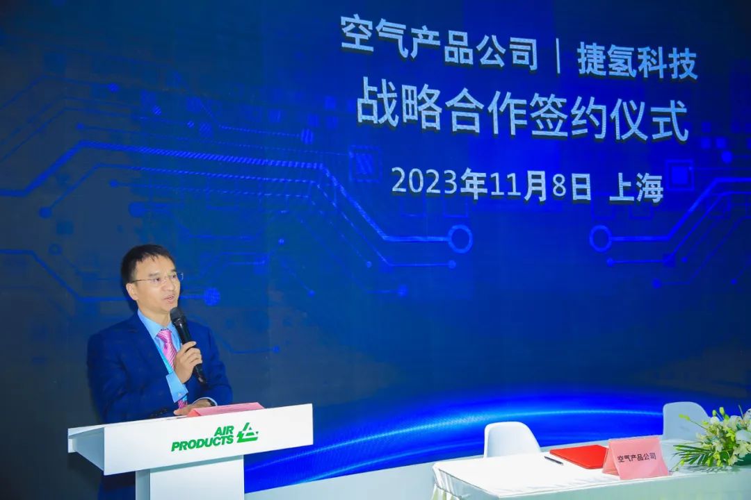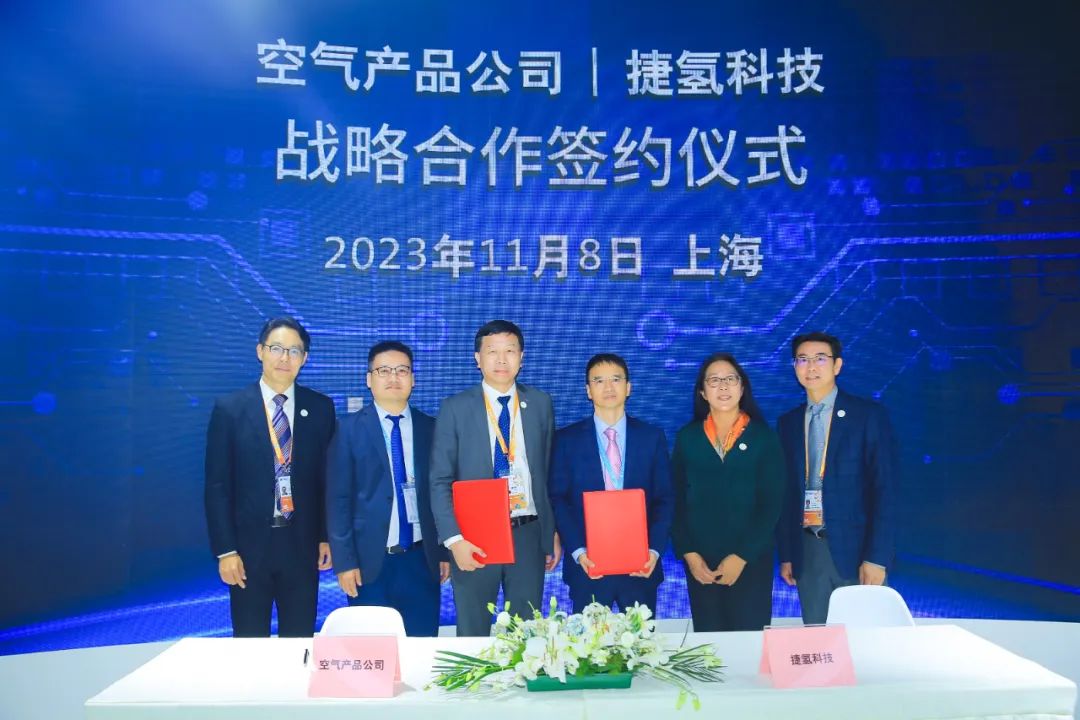 11月8日,上海捷氫科技股份有限公司(簡稱捷氫科技)與空氣產品公司戰略合作協議簽約儀式在第六屆進博會現場舉行。捷氫科技總經理盧兵兵、空氣產品公司中國區氫能業務總經理胡華利代表雙方簽約。