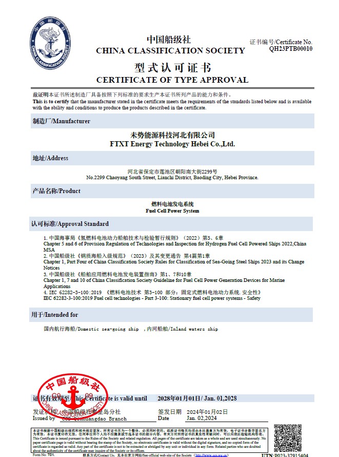 近日,未勢能源自主研發的船用燃料電池發電系統,順利獲得中國船級社(CCS)頒發的型式認可證書,標志著未勢能源在氫能船舶關鍵技術領域取得了新的突破,進一步提升了在氫能船舶領域的市場競爭力。