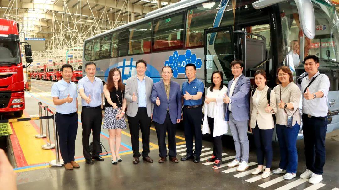 調(diào)研團(tuán)首先走進(jìn)國鴻氫能云浮基地科技展廳和智能生產(chǎn)線,了解國鴻氫能發(fā)展歷程、技術(shù)研發(fā)、生產(chǎn)布局、商業(yè)化應(yīng)用等方面情況,并親身觀看燃料電池的制造過程。隨后,調(diào)研團(tuán)試乘氫能旅游巴士,考察燃料電池系統(tǒng)整車組裝車間的多款重型氫能車。