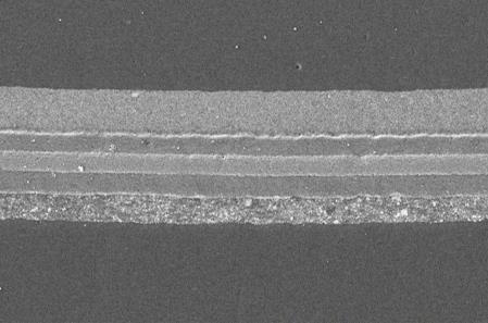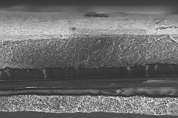 未勢能源開發(fā)了批量化截面制備技術(shù)。將多片大小一致的MEA樣品并排置于模具中,兩端固定,倒入特定比例的快速固化樹脂液和固化劑,真空消泡后,利用紫外光固化,快速得到不含氣泡的堅硬樹脂塊。利用自動磨拋機,選擇不同目數(shù)的砂紙打磨直到露出樣品面后,獲得光滑平整截面(圖5),此種方法特別適合大批量的樣品,極大的節(jié)省制樣時間,縮短測試周期,提高測試效率。并且由圖6可以看出,制備后的截面各部分分層清晰,保留了MEA材料的本征形貌。