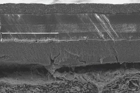 MEA作為質(zhì)子交換膜燃料電池中最核心部件,對整個電池的性能起著關(guān)鍵作用,主要是由質(zhì)子交換膜(PEM)、催化層(CCM)、氣體擴散層(GDL)、和邊框膜構(gòu)成(圖1)。燃料電池中為了提高電堆的體積功率會盡可能降低MEA的厚度,現(xiàn)有MEA的厚度通常為50μm左右,MEA的破壞普遍表現(xiàn)為催化層腐蝕,催化層脫落,催化層減薄,催化層斷裂,質(zhì)子交換膜減薄,穿孔以及氣體擴散層腐蝕等。一般常規(guī)光學顯微鏡和金相顯微鏡的放大倍率,不足以觀測到催化層和質(zhì)子交換膜的微觀形貌,需要利用更高放大倍數(shù)的顯微鏡對MEA的表面和截面進行分析。SEM作為材料形貌表征的常用且重要手段,超高的放大倍率使得MEA表面和截面樣品的形貌得到更好的呈現(xiàn)。但是由于MEA結(jié)構(gòu)的特殊性,常規(guī)的SEM制樣方法和測試方法已經(jīng)無法滿足測試需求。