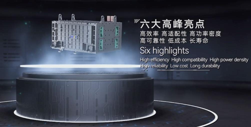 300+KW膨脹石墨板電堆,極板、膜電極、密封、節電壓檢測模塊、端板等關鍵零部件均已實現100%國產化,具有高效率、高功率、長壽命、高可靠性、高適配性等優勢,最高效率達到68%,峰值功率密度達到4.0KW/L,柔性石墨板單板厚度0.65mm,雙極板的厚度1.3mm,設計壽命3萬小時,綜合性能指標達到國際先進水平,可以靈活匹配商用車、船舶及鐵路車輛等場景。
