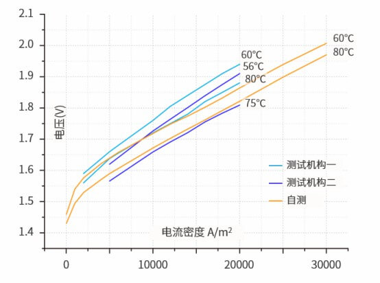 目前,莒納科技的PEM膜電極已經由第三方權威機構完成樣品測試。根據電解槽廠商的測試數據,莒納科技膜電極在載量降低的同時能夠維持和先進PEM電解水膜電極相同水平的性能,滿足工程應用的要求。