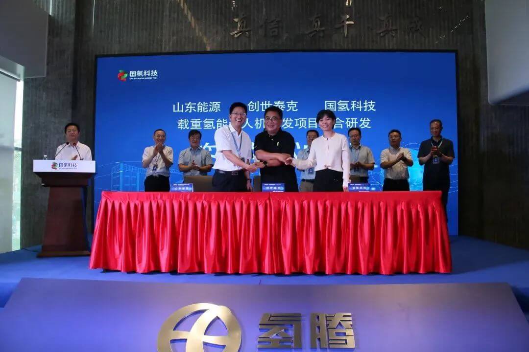 在活動現場,國氫科技與濟南起步區管委會簽訂“氫進萬家”科技示范工程合作框架協議,雙方將合力打造氫熱電聯供示范應用標桿,推動氫能、電能和熱能系統融合,為全國提供氫能進家入戶的示范樣本;國氫科技與山東能源、中國商飛北研中心簽訂海上風光氫能無人機智能巡檢合作協議,共同推動氫動力無人機在電力巡檢領域的應用;國氫科技與山東能源、創世泰克簽訂載重氫能無人機研發項目聯合研發協議,共同推動載重氫能無人機研發與產業化;濟南綠動與山東大學簽訂戰略合作框架協議,雙方在氫能關鍵技術合作開發、人才聯合培養、研發平臺共建等方面開展合作。
